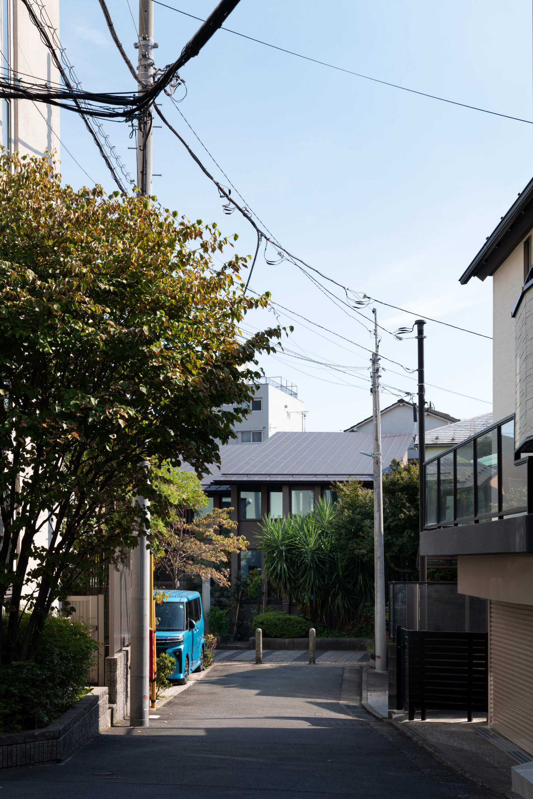 かつての川は人々が行き交う緑道へと姿を変え、この家もまた、庭木の成長と共に緑に包まれていくだろう。こうした変化と時間の流れの中で、建築が変わらず人の感覚を「今」へと導く存在となることを目指した。