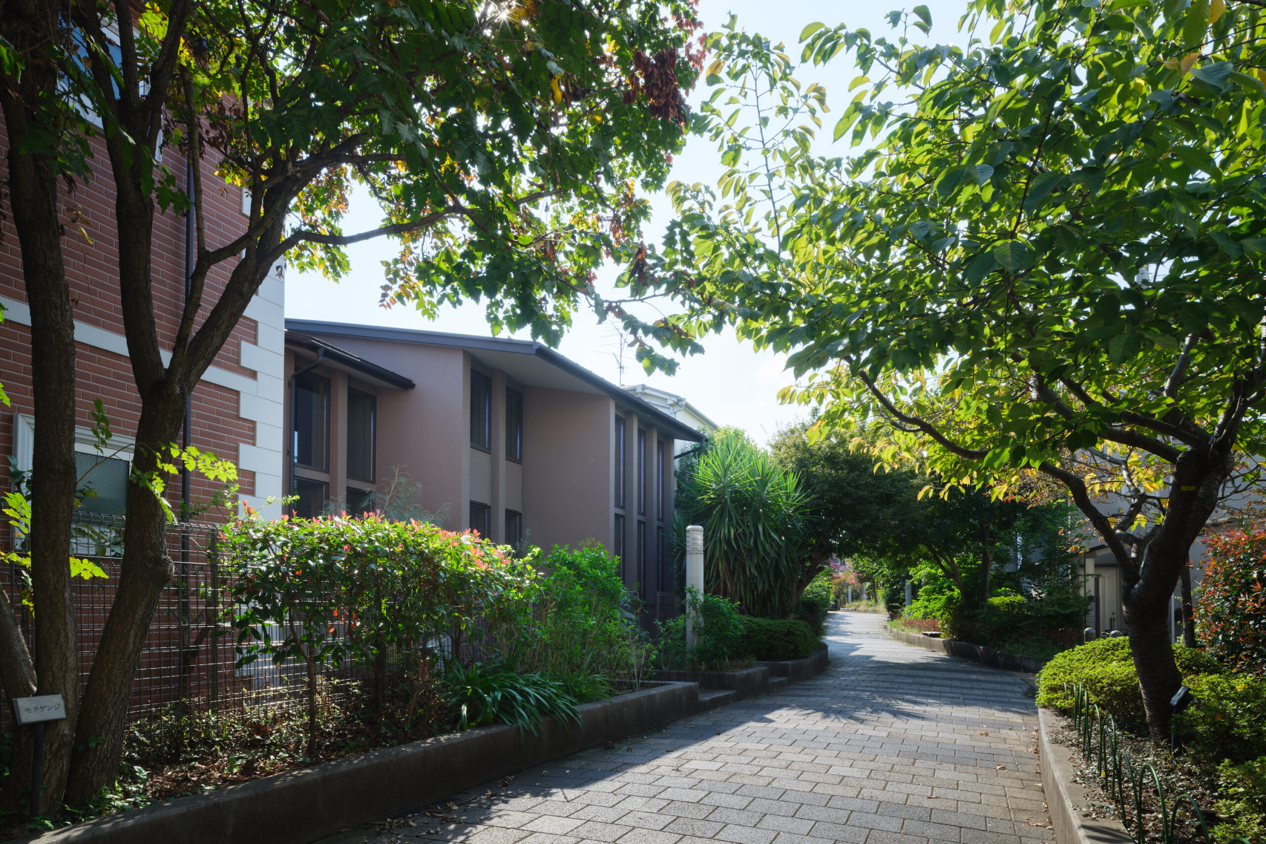 木々への眺望がある候補地を建主と巡り、辿り着いたのが緑道に面したこの敷地だった。川が暗渠化されてできた緑道は南北の台地に挟まれた谷地にあたり、敷地も道路から緑道へ向かって1mほど下がっている。敷地は袋小路の最奥にあるため付近に車の通過交通はなく、都市の喧騒から離れた静かな環境であった。