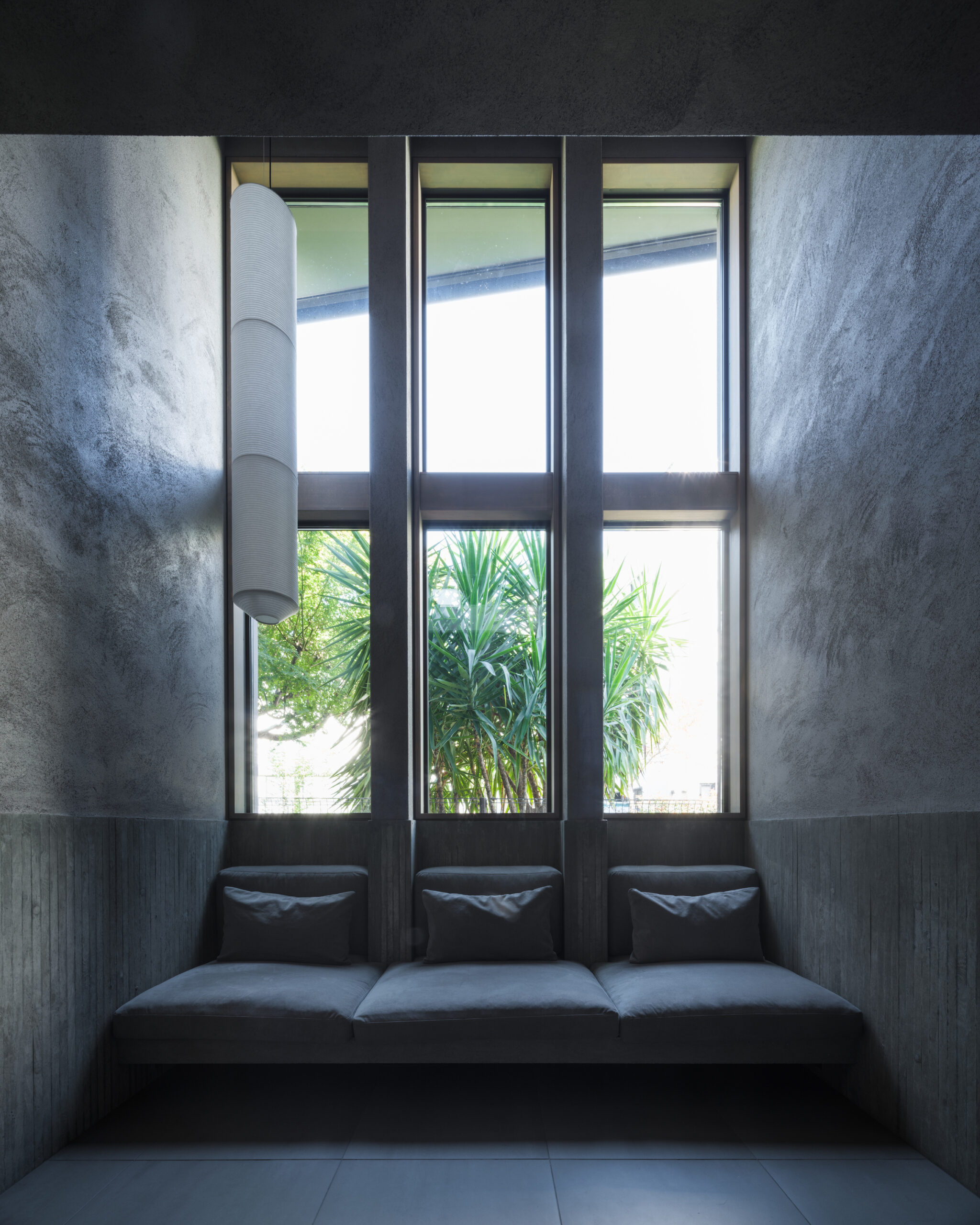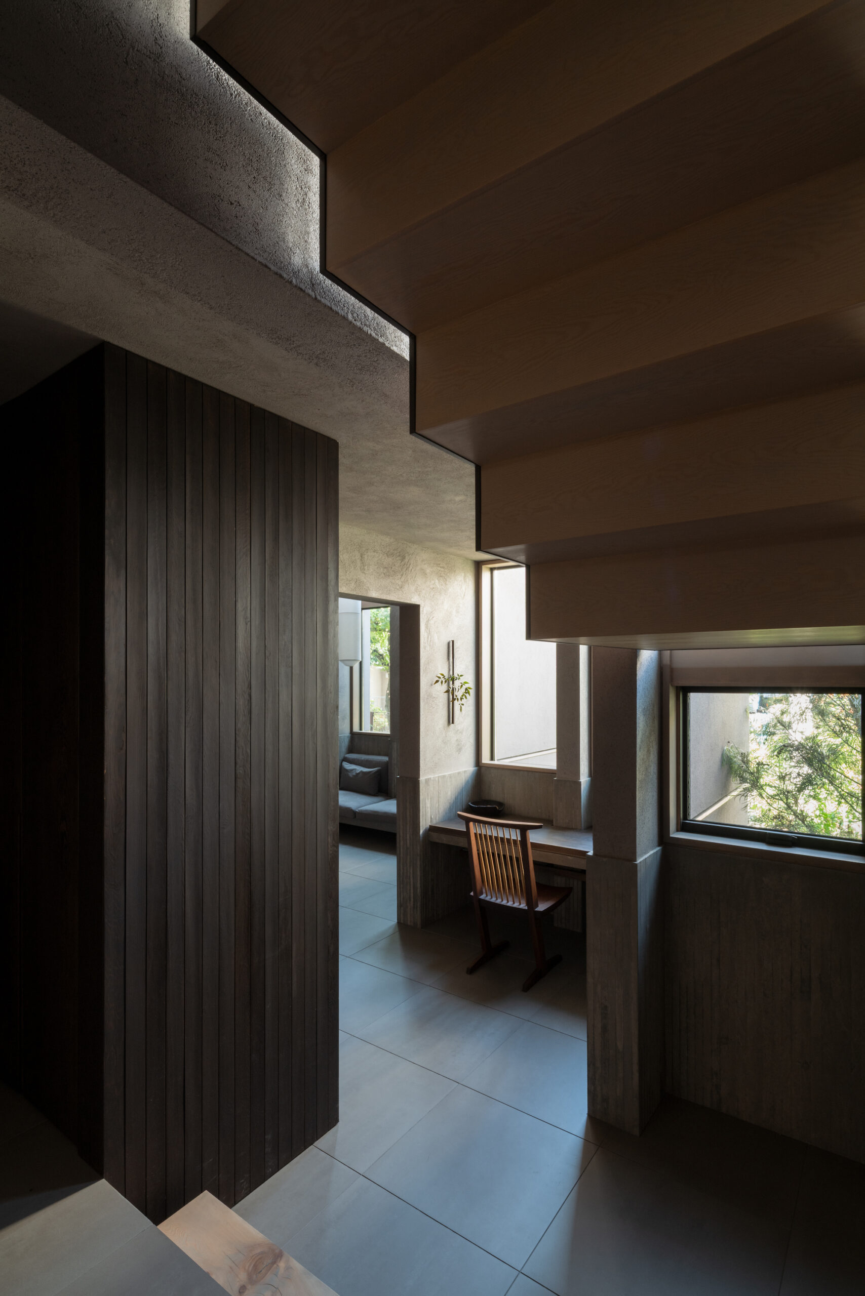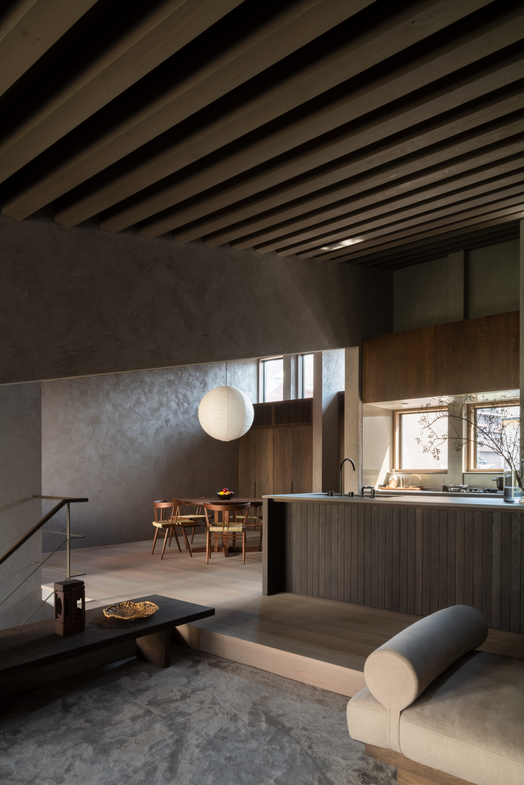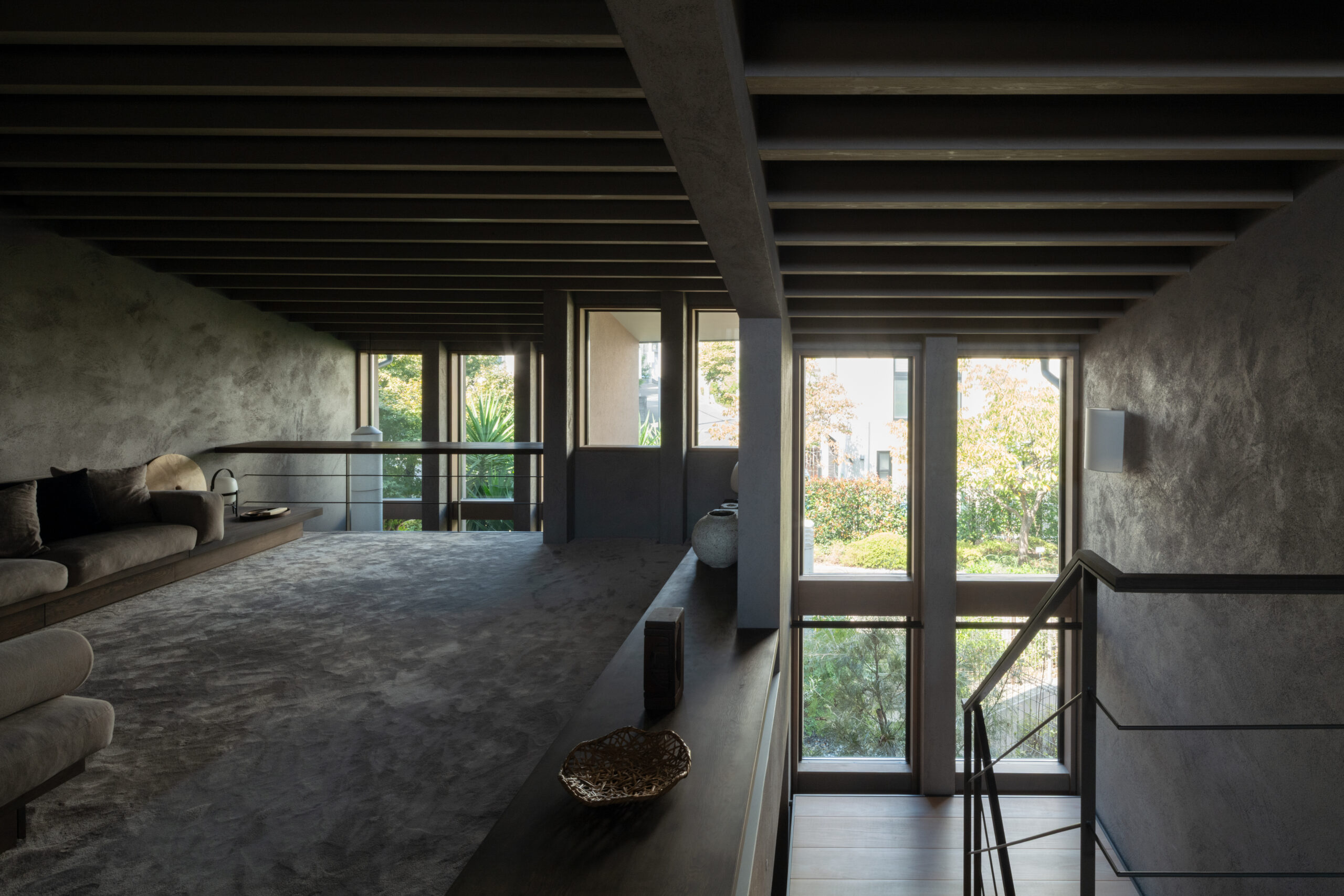 建主は、この家では時間の流れがゆっくりと感じられると語った。壁柱による奥行きのある開口は、緑道と室内という異なる領域を際立たせ、風に揺れる緑道の木々や人の動きを鮮明に切り取る。一方、室内の静けさはその対比によって引き立ち、まるで洞窟の中から外界を眺めるような初源的な感覚と共に、意識は今という瞬間へ開かれていく。