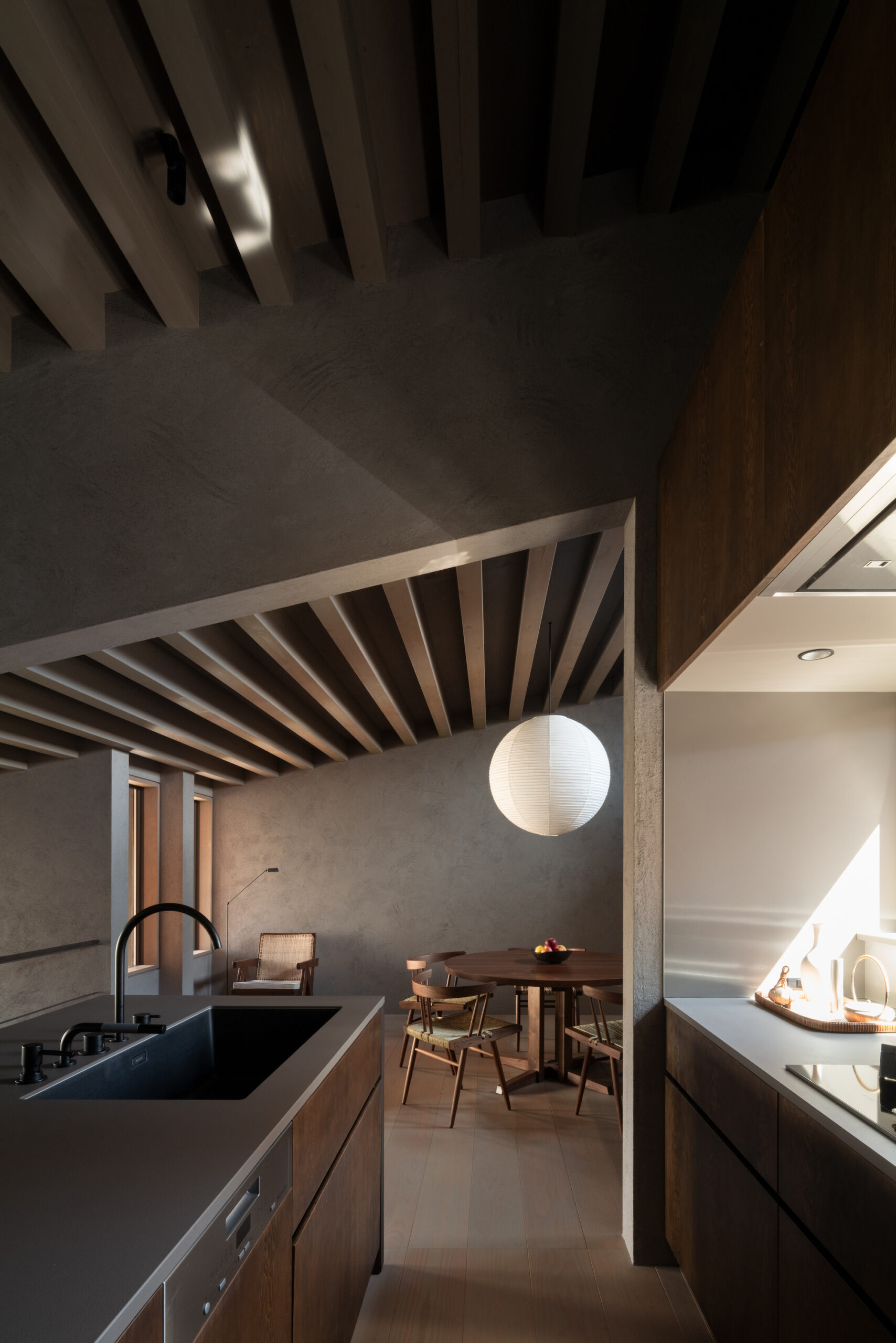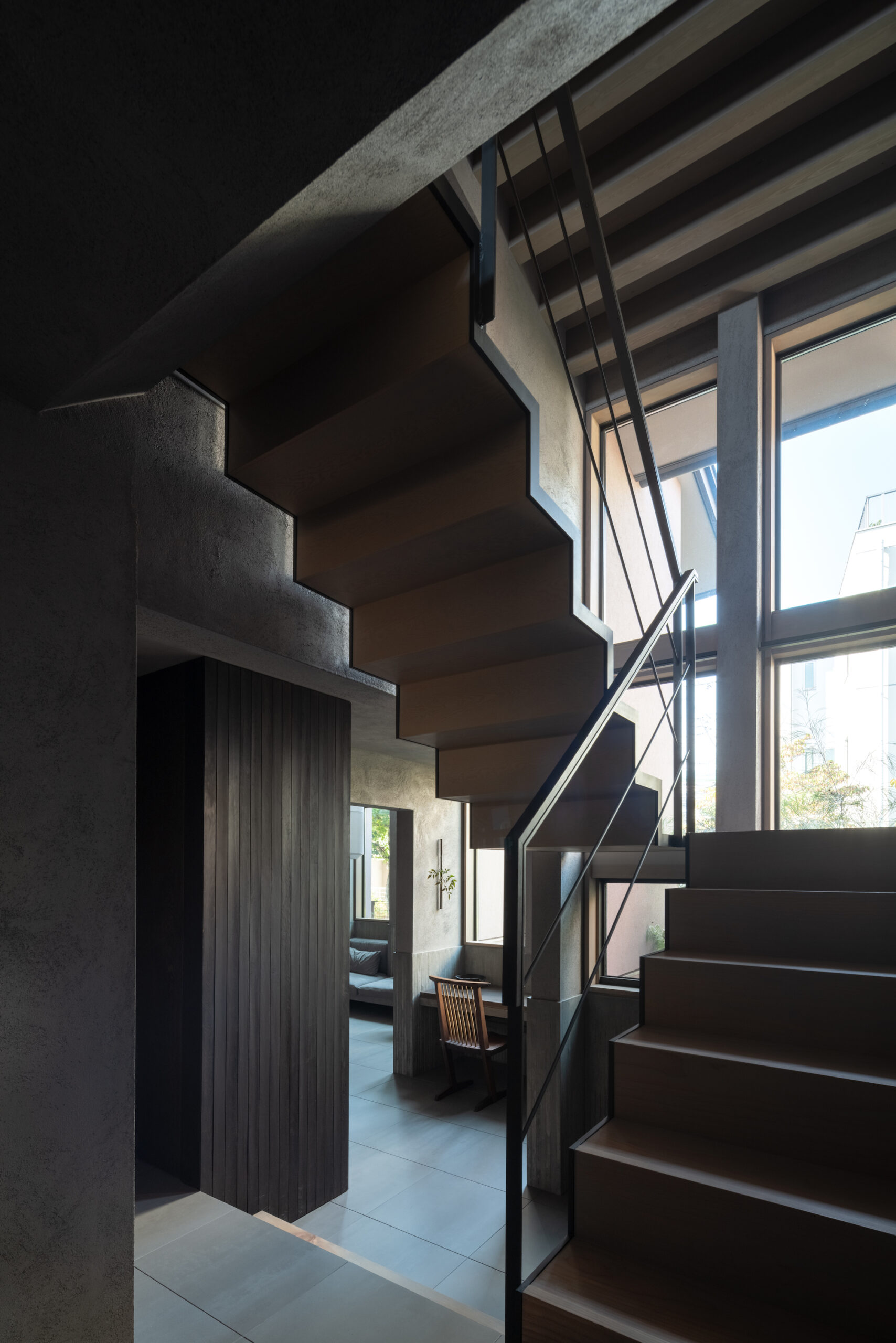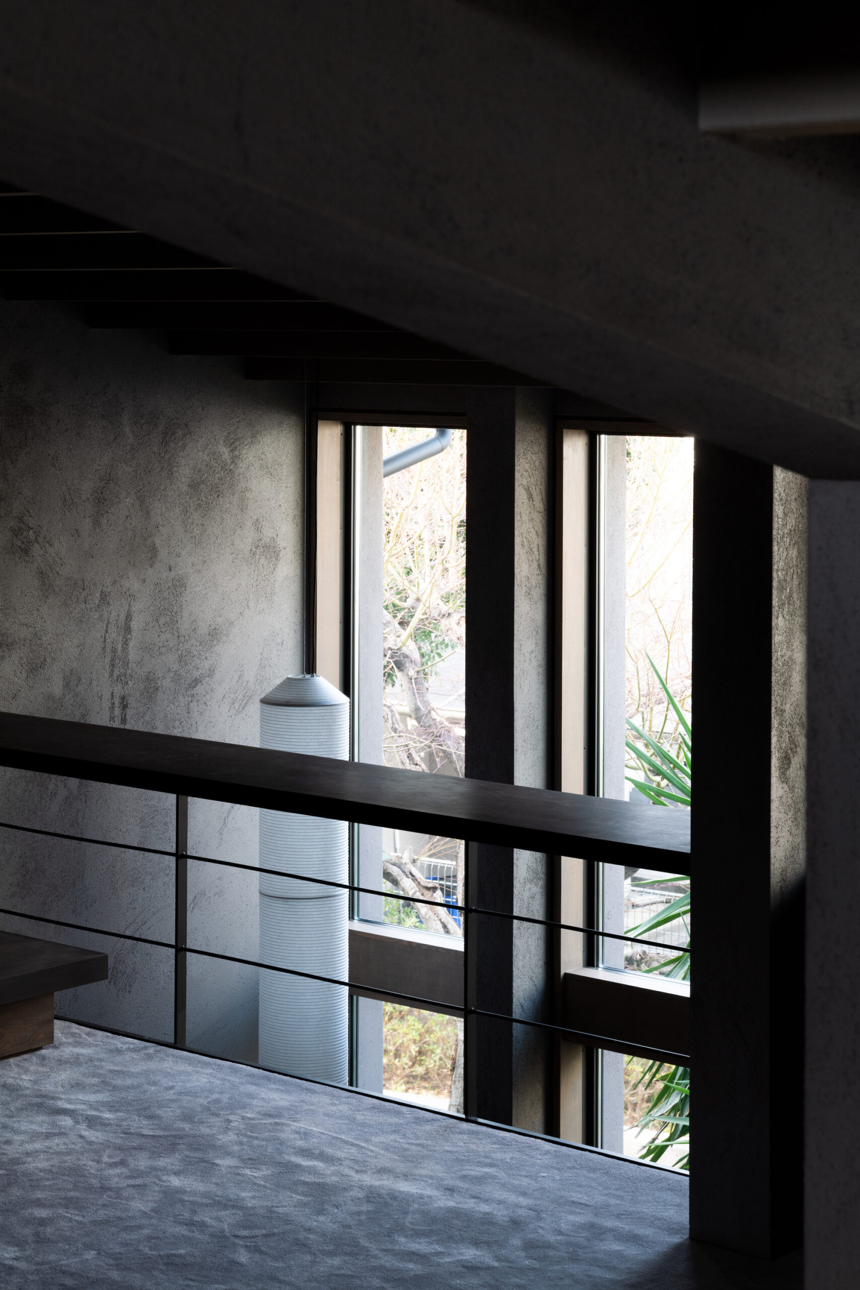 建主は、この家では時間の流れがゆっくりと感じられると語った。壁柱による奥行きのある開口は、緑道と室内という異なる領域を際立たせ、風に揺れる緑道の木々や人の動きを鮮明に切り取る。一方、室内の静けさはその対比によって引き立ち、まるで洞窟の中から外界を眺めるような初源的な感覚と共に、意識は今という瞬間へ開かれていく。
