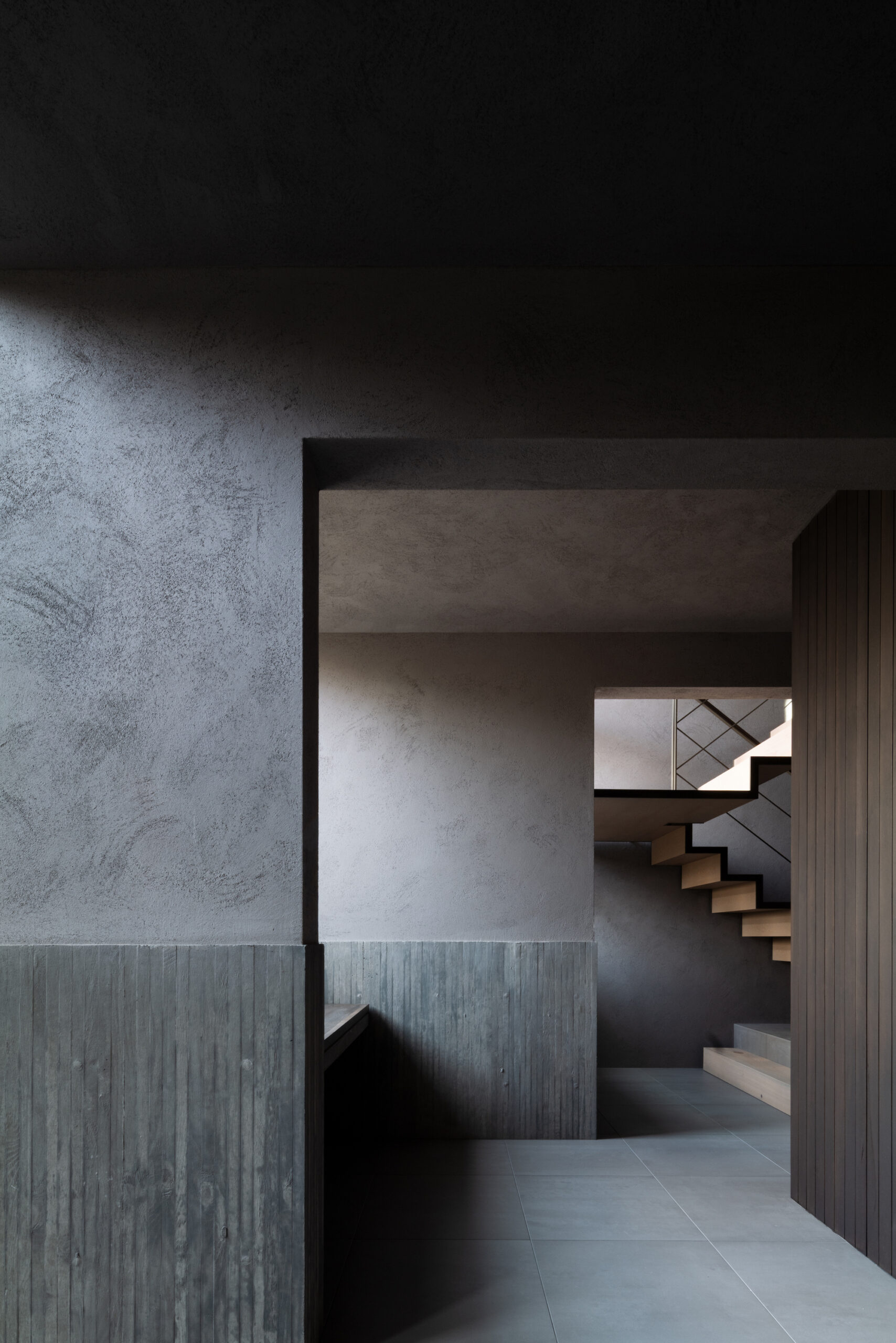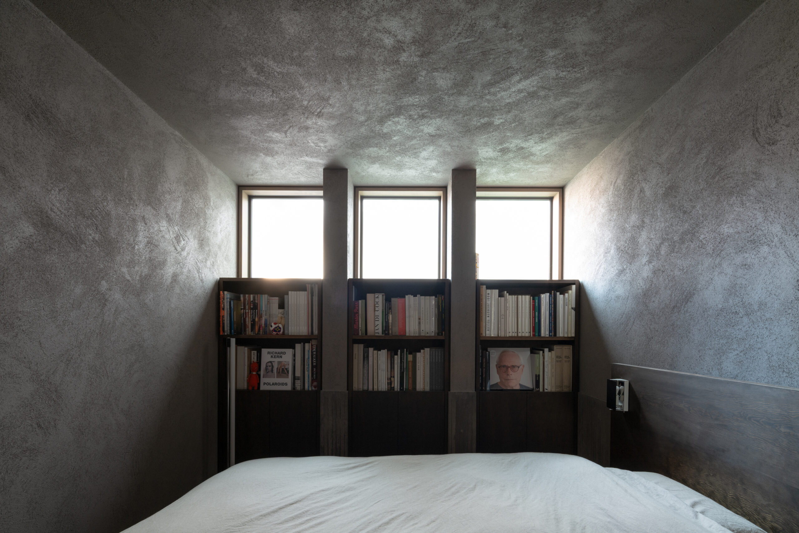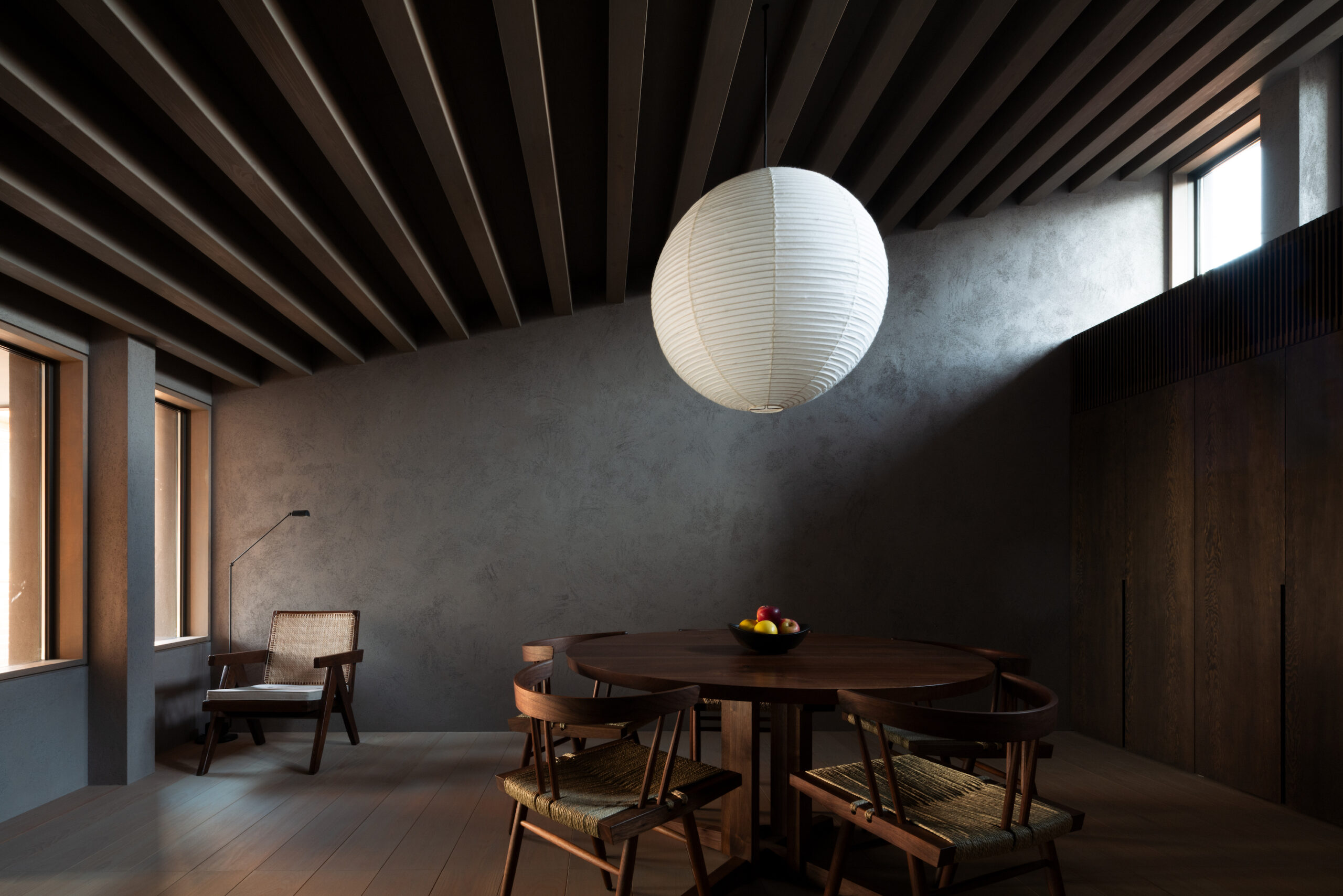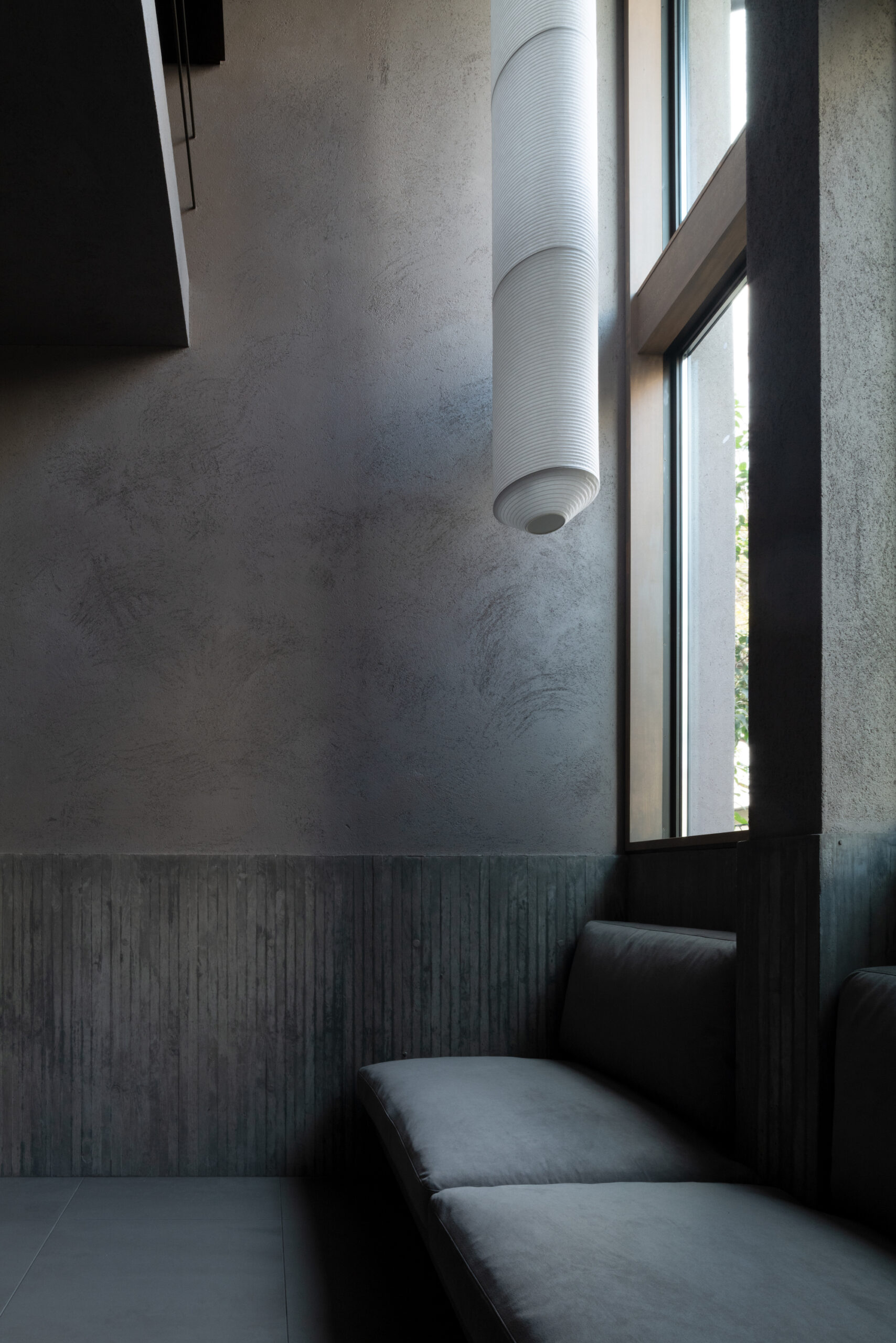 建主は、この家では時間の流れがゆっくりと感じられると語った。壁柱による奥行きのある開口は、緑道と室内という異なる領域を際立たせ、風に揺れる緑道の木々や人の動きを鮮明に切り取る。一方、室内の静けさはその対比によって引き立ち、まるで洞窟の中から外界を眺めるような初源的な感覚と共に、意識は今という瞬間へ開かれていく。