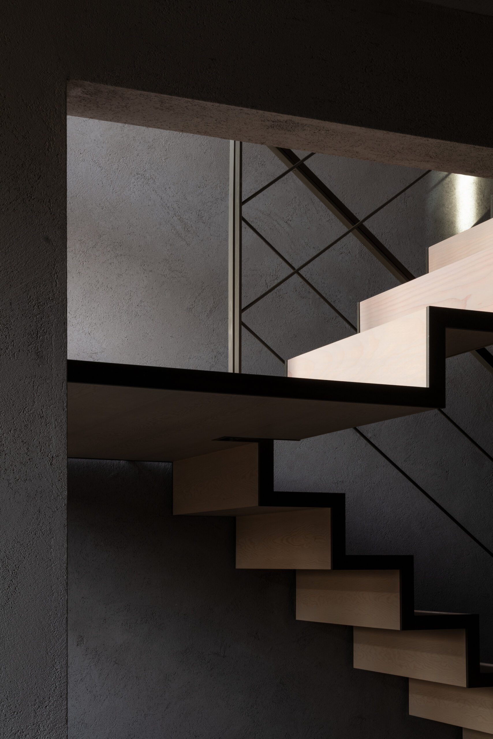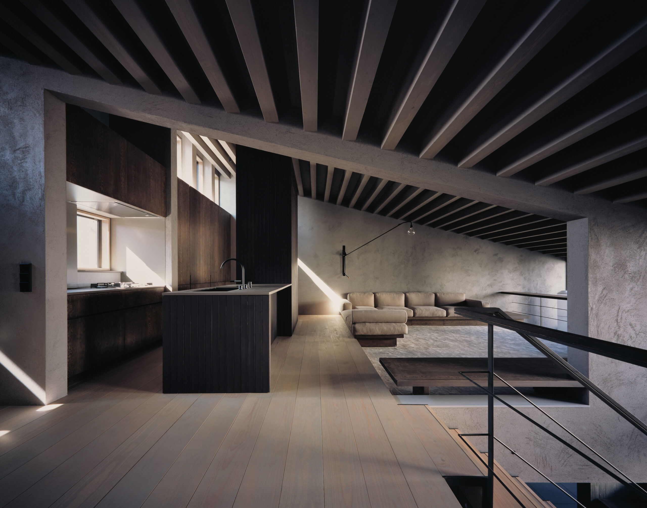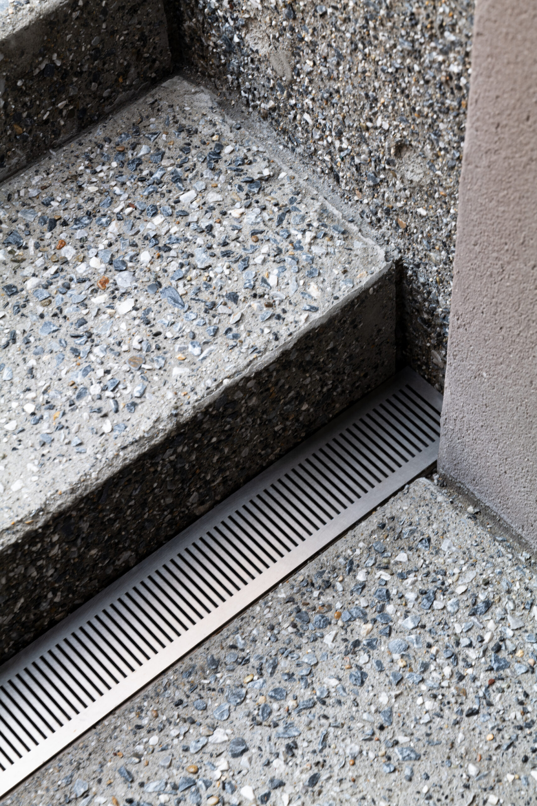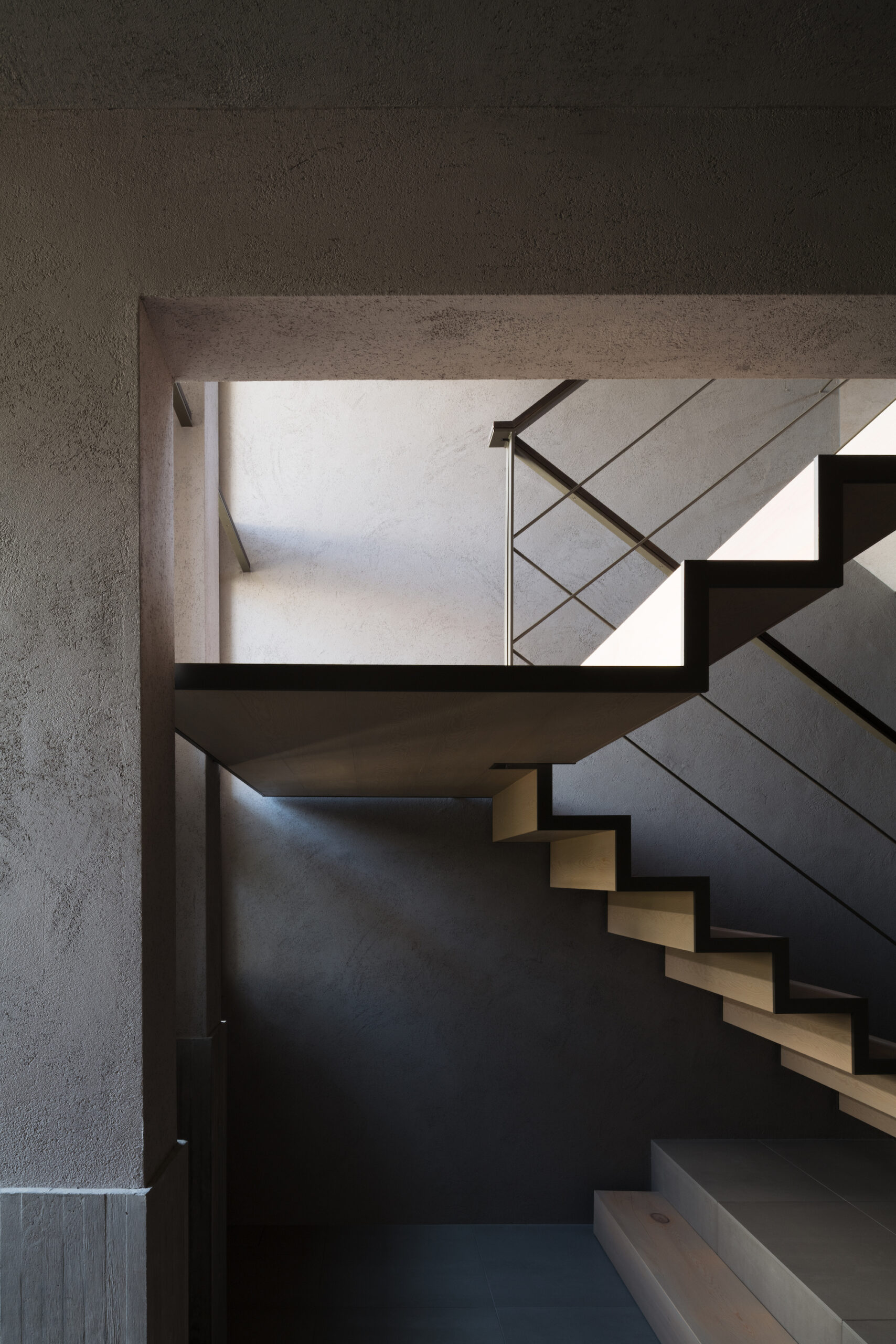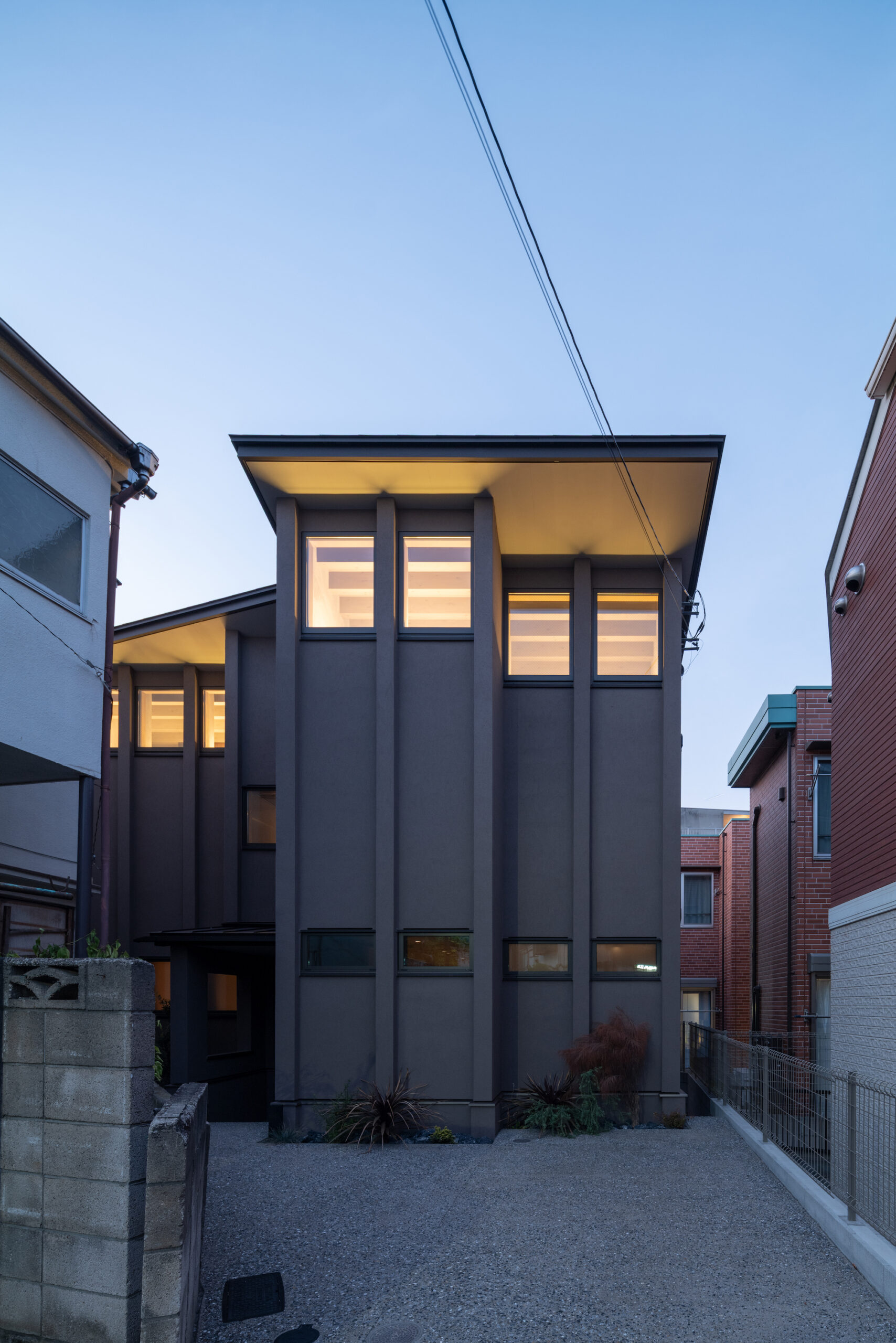 断面計画では地形に呼応し、緑道へ視線を導く2枚の屋根を架け、厳しい斜線制限を躱しつつ、低い軒で北側建物からの視線を遮り、落ち着いたスケール感を実現した。また敷地は内水氾濫による浸水が想定されているため、高基礎にしながらも、量塊感のあるコンクリートで内部を囲い込むことによる安心感をもたらした。