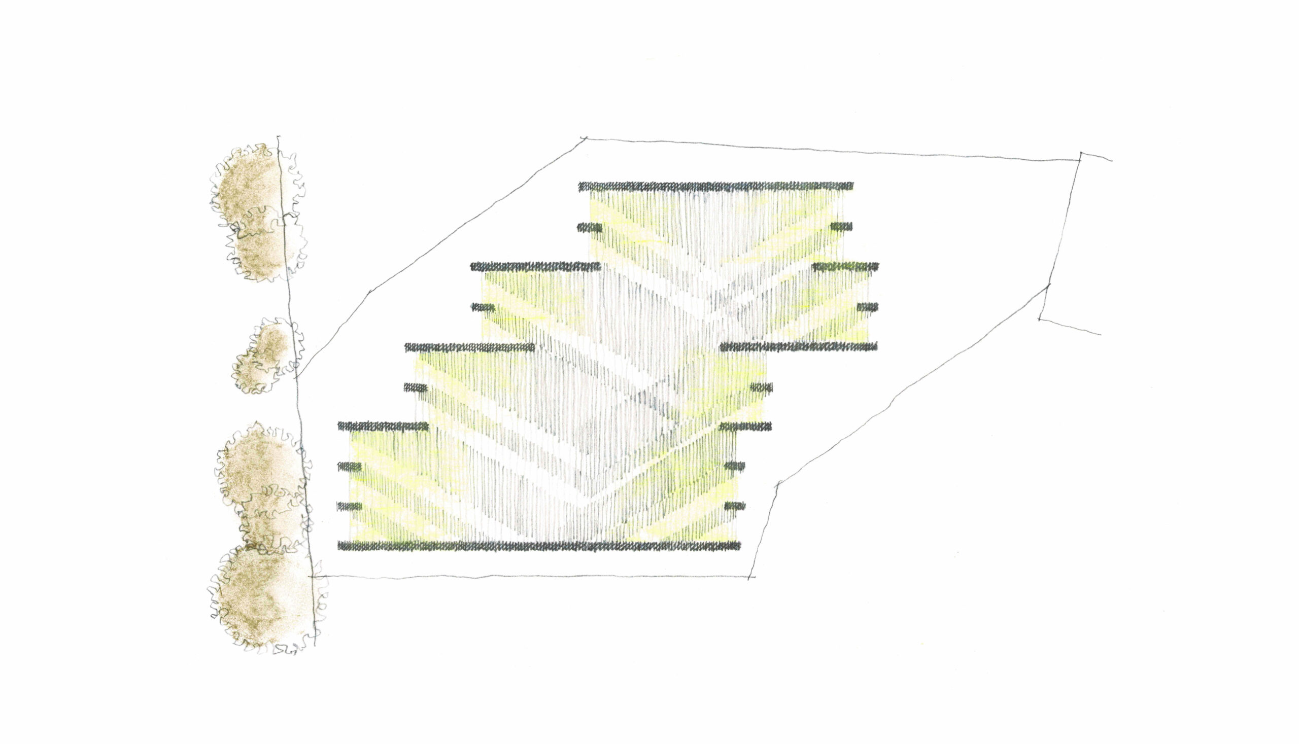 一方、緑道には歩行者の往来があり距離も近く、ただ開くのではなく適切な関係を築く必要があった。そこで緑道に直交する壁柱の列柱を設け、壁柱に沿った視線の抜けを確保しつつ斜め方向の視線を遮ることで、守られながら開かれる空間を目指した。同時に壁柱は構造上の要となり、半間間隔の柱割りは耐熱強化ガラスによる大きな開口を可能にしている。平面は不整形な敷地に沿うように雁行させ、敷地形状がもつ対角線方向の抜けを活かした。